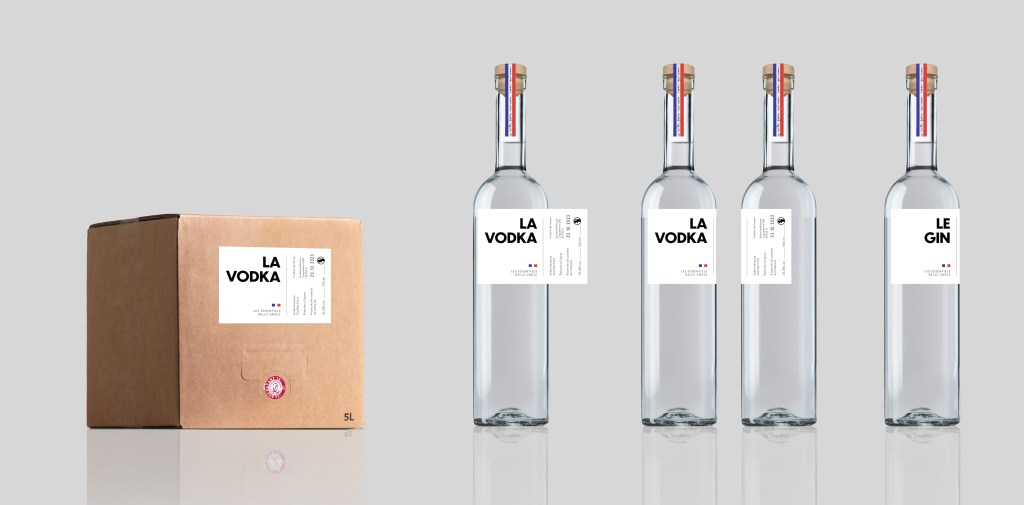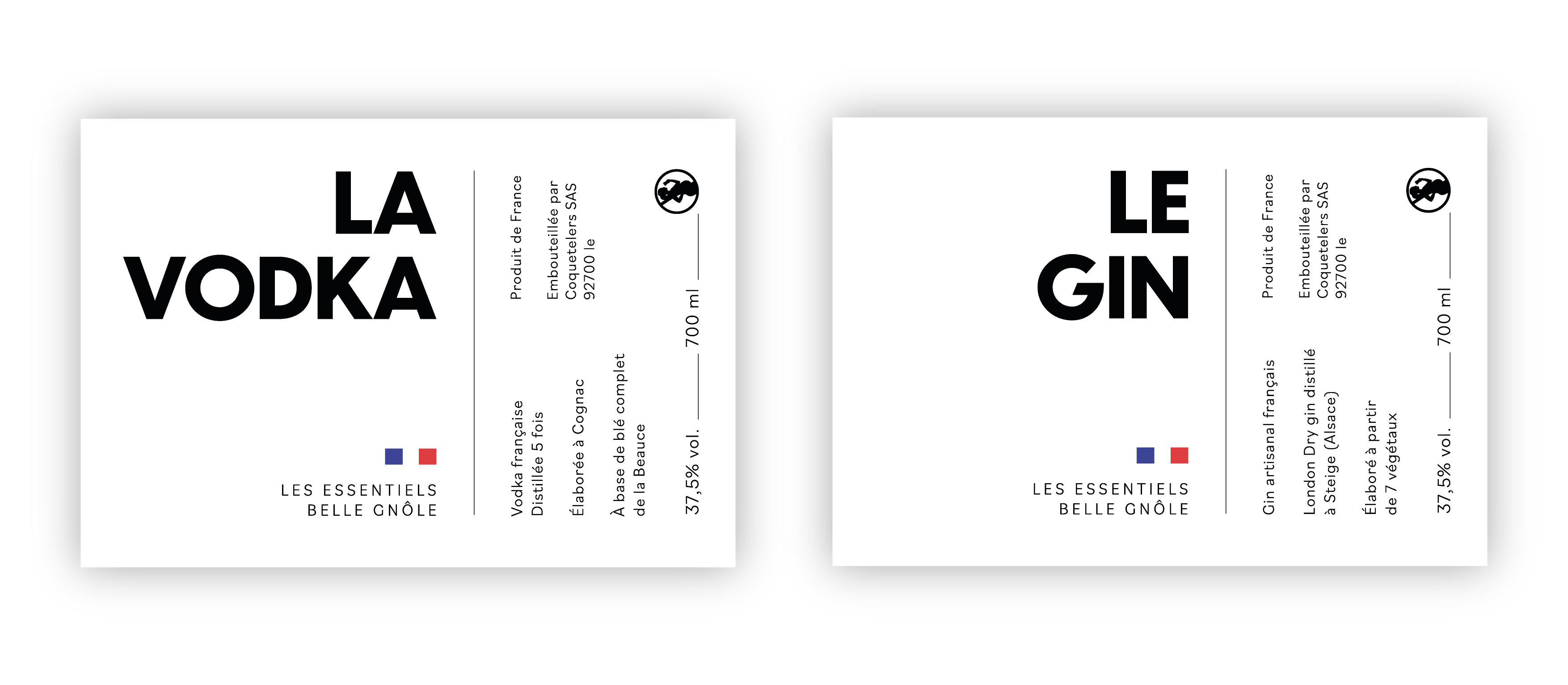 Belle Gnôle – Packaging Identité, Packaging Création du packaging pour les Essentiels de Belle Gnôle. Etiquettes pour la vodka, le gin et les cartons de 5L. Avril 2023.